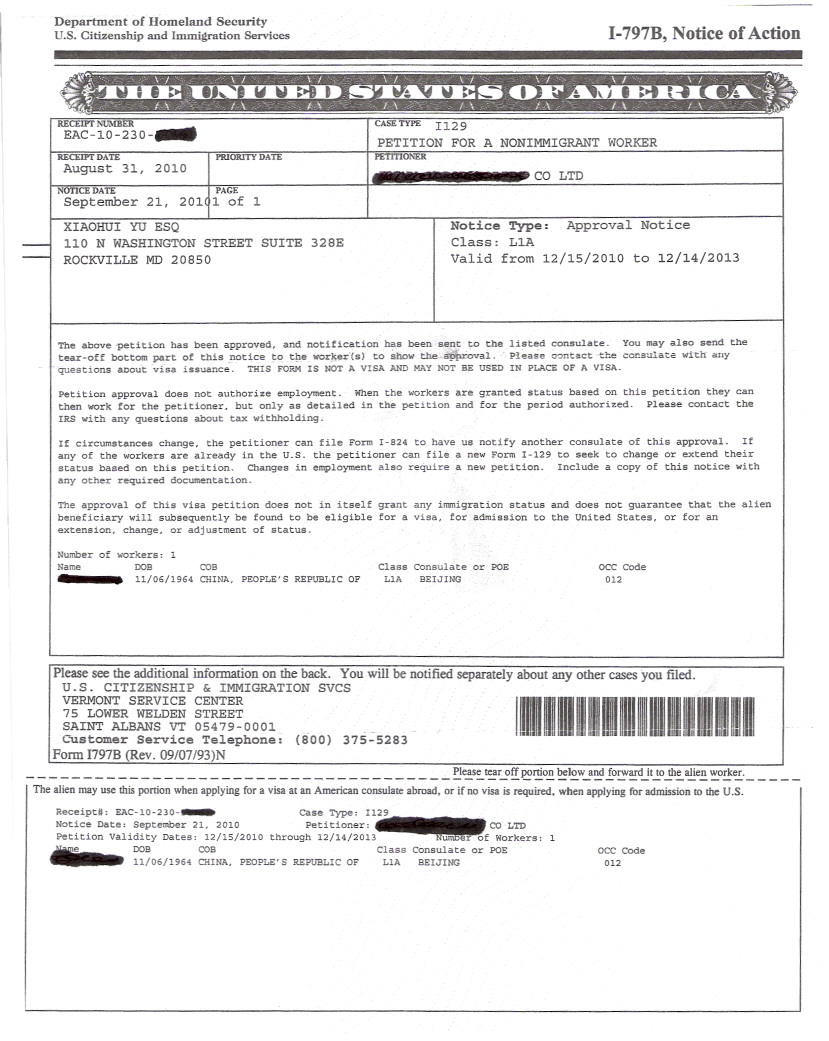 Thanks to our clear and strong presentation of the evidence, Ms. Feng¡¯s L-1 case, submitted in August 2010, was approved in 2 weeks via premium processing. Ms. Feng is now eligible to legally work in the U.S. to head the operation of the client¡¯s U.S. subsidiary.