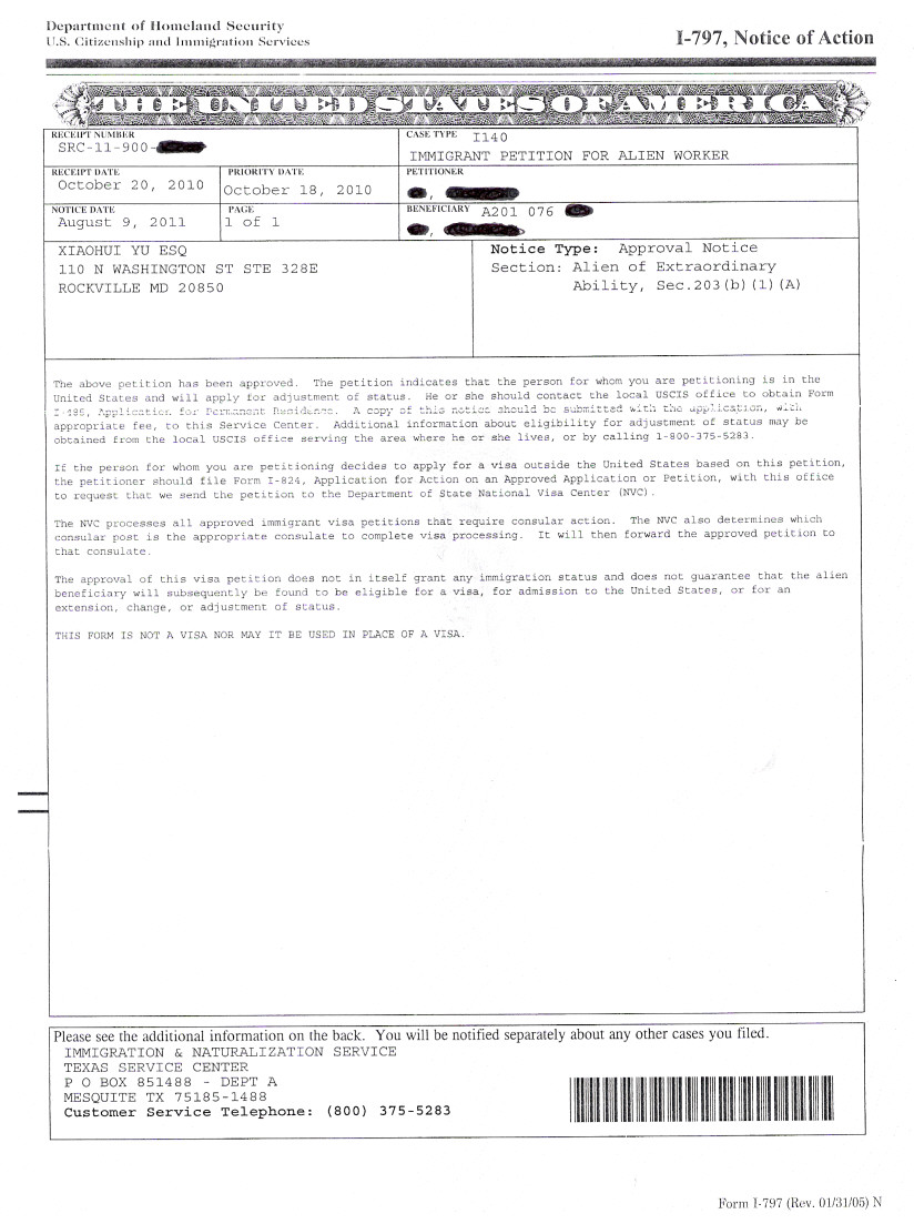 Dr. Zhang sought the legal help of our firm to file an Immigrant Visa Petition for Alien of Extraordinary Ability and a National Interest Waiver Case. Our attorneys used the solid evidence Dr. Zhang provided to demonstrate she is an alien with extraordinary ability who is at the top of her field in biomedical research. In the petition, we provided evidence demonstrating Dr. Zhang’s novel abilities and achievements through her multiple published works, her nationally and internationally recognized awards, memberships in several scholarly and scientific societies, her participation in international conferences, presentations/speeches to the scientific community, and also by her judgment on the work of others as a reviewer.